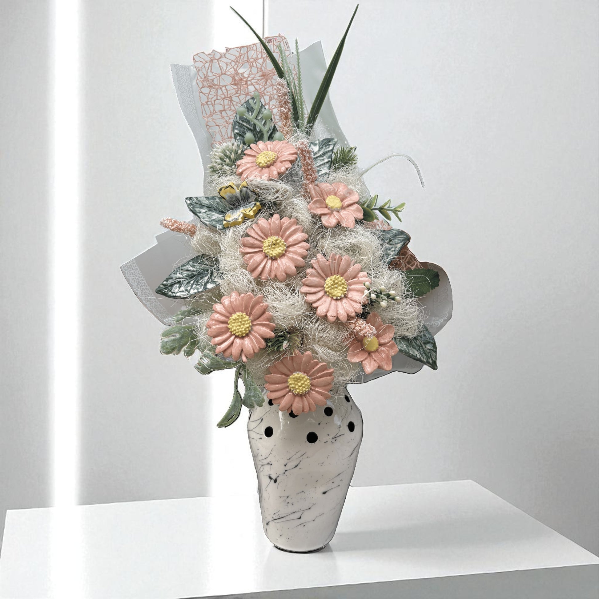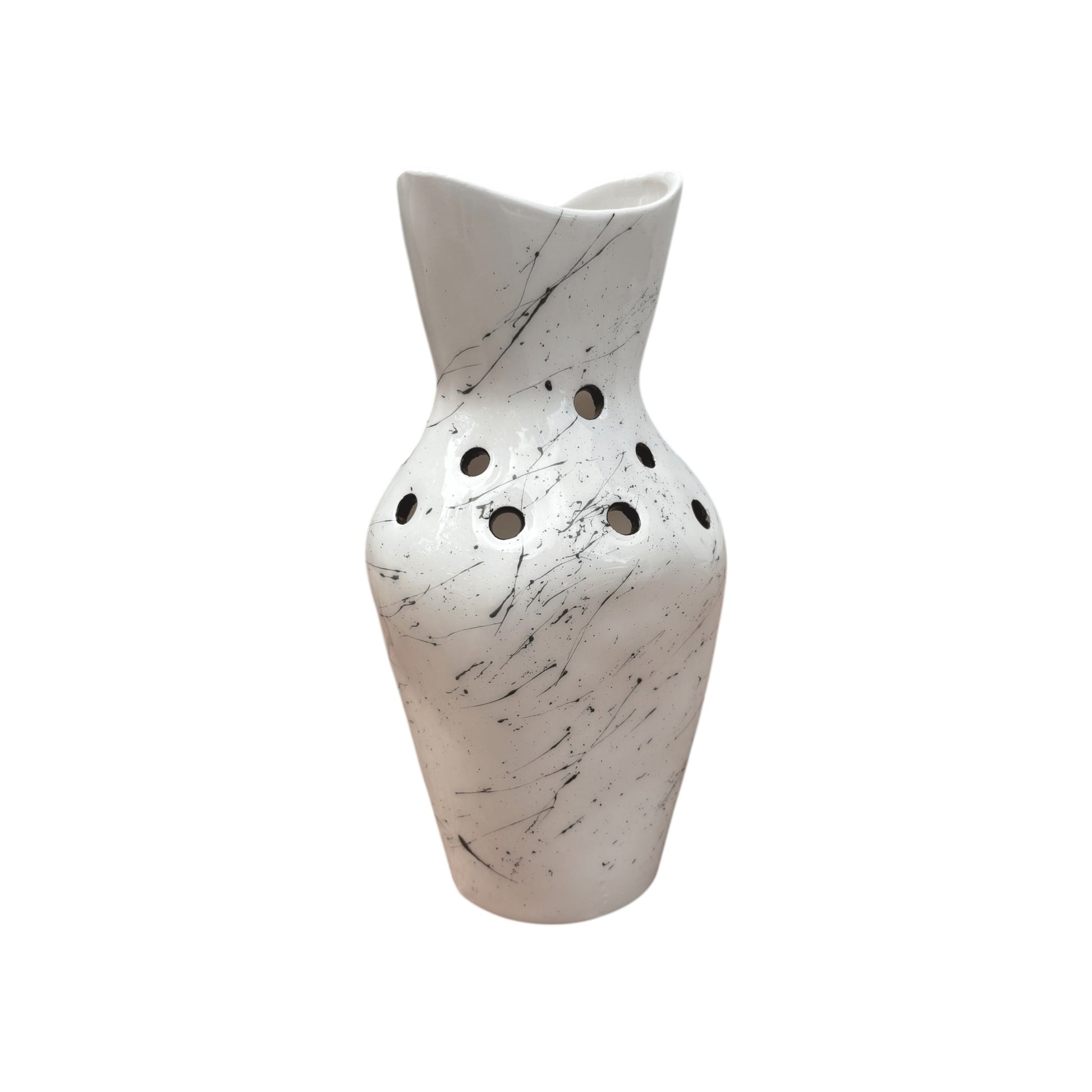 Ova unikatna keramička vaza sa zanimljivim apstraktnim crnim šarama na svijetloj podlozi donosi savršenu ravnotežu između rustikalnog i modernog dizajna. Ručno izrađena, s nepravilnim detaljima koji joj daju karakter, ova vaza je idealan dekorativni komad za ljubitelje minimalističkog i umjetničkog izraza.
